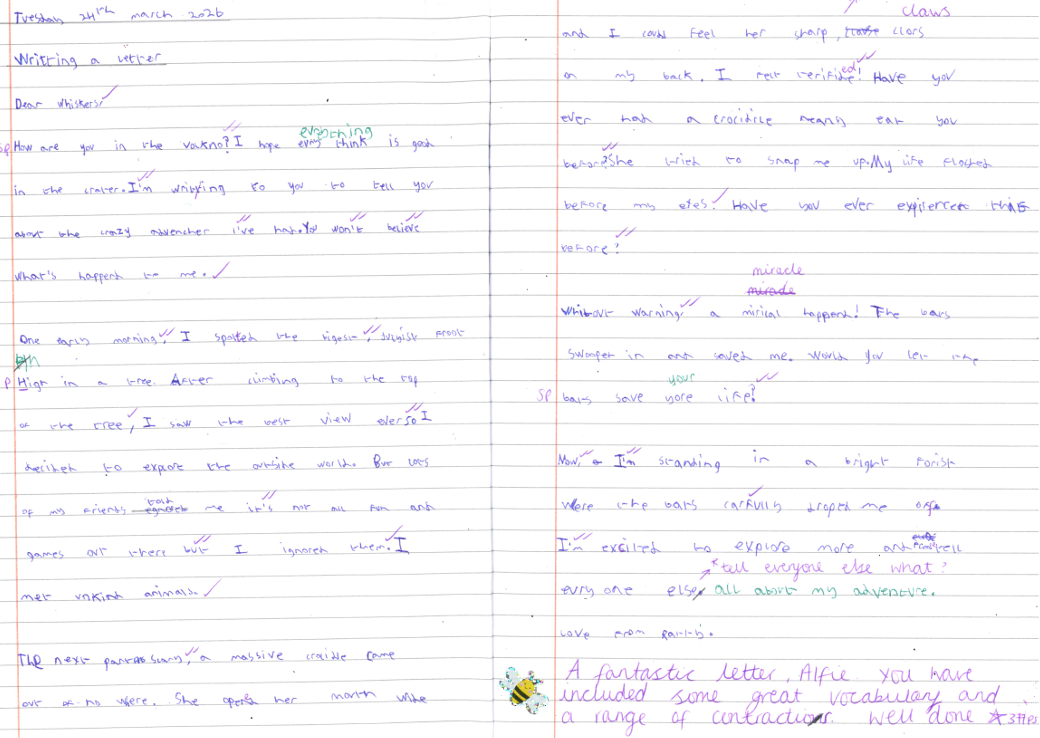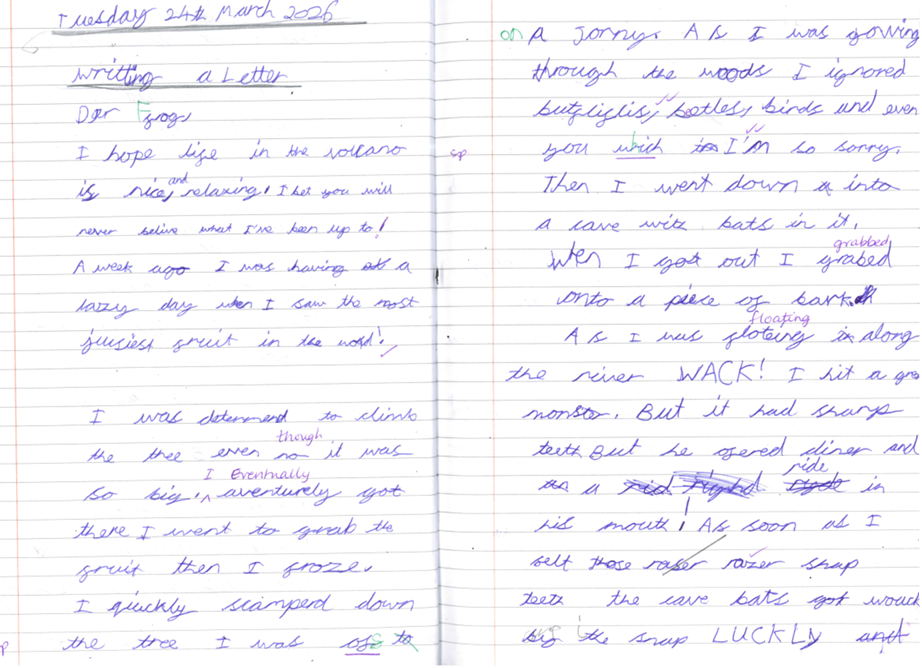 Our main writing outcome this term was creating a letter in role as Ratty, imagining what he would write to his friends back in the volcano after being dropped by the bats. The children drew on everything they had learned about his journey to describe where he was, what he had experienced and how he was feeling. They produced thoughtful, imaginative letters that showed a deep understanding of Ratty’s adventure and the challenges he faced.