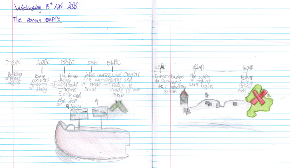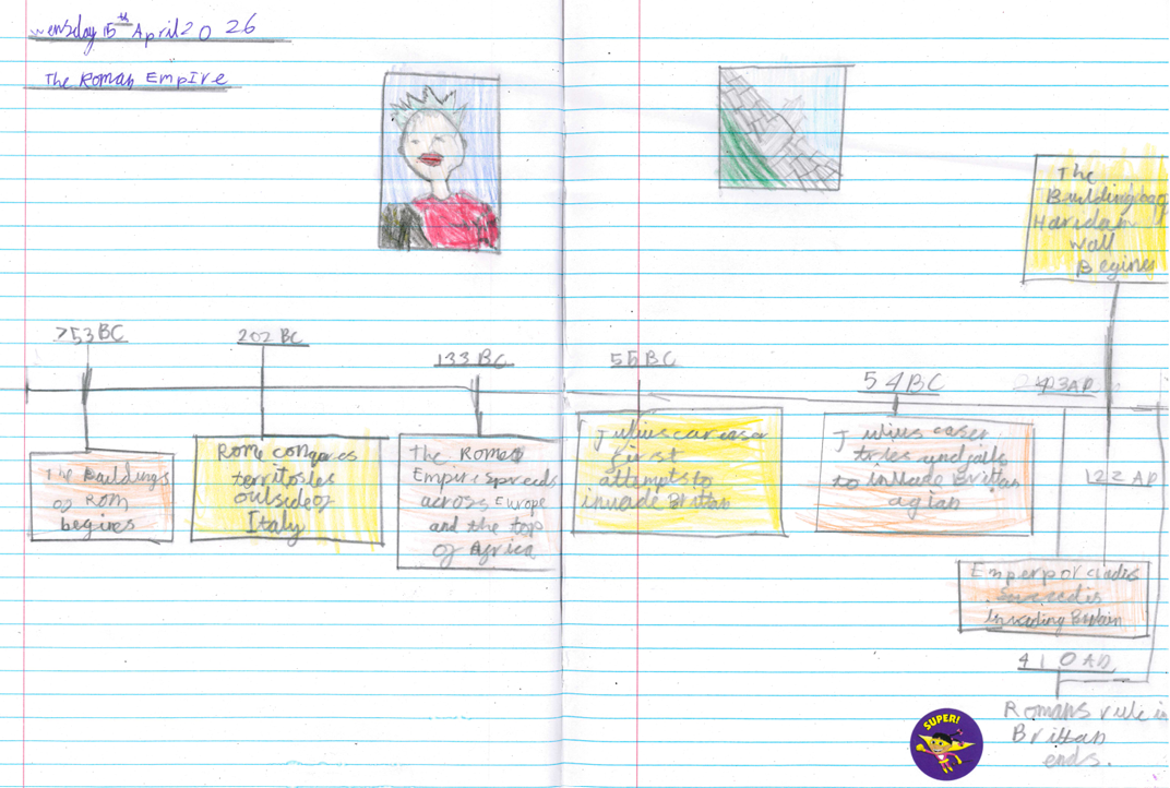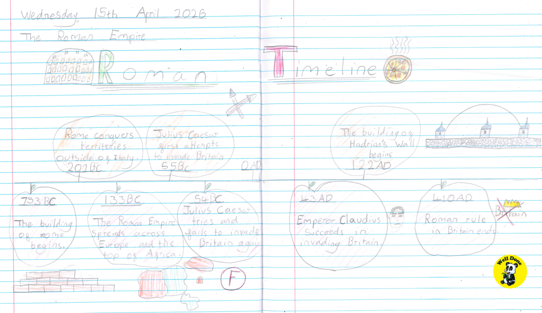 In our topic lessons, the children have been exploring the Roman Empire in greater depth. To begin, they discussed where the Romans sit within history, comparing them to other well‑known periods and events such as the Ancient Egyptians, the Stone Age, the Tudors and even the Titanic. This helped them develop a clearer sense of chronology and how different civilisations and events connect across history. After this introductory discussion, the children focused specifically on the Roman Empire and created detailed timelines in their books. These included significant events such as the building of Hadrian’s Wall and the Roman invasion of Britain, helping them understand how key moments in Roman history unfolded and connected over time.