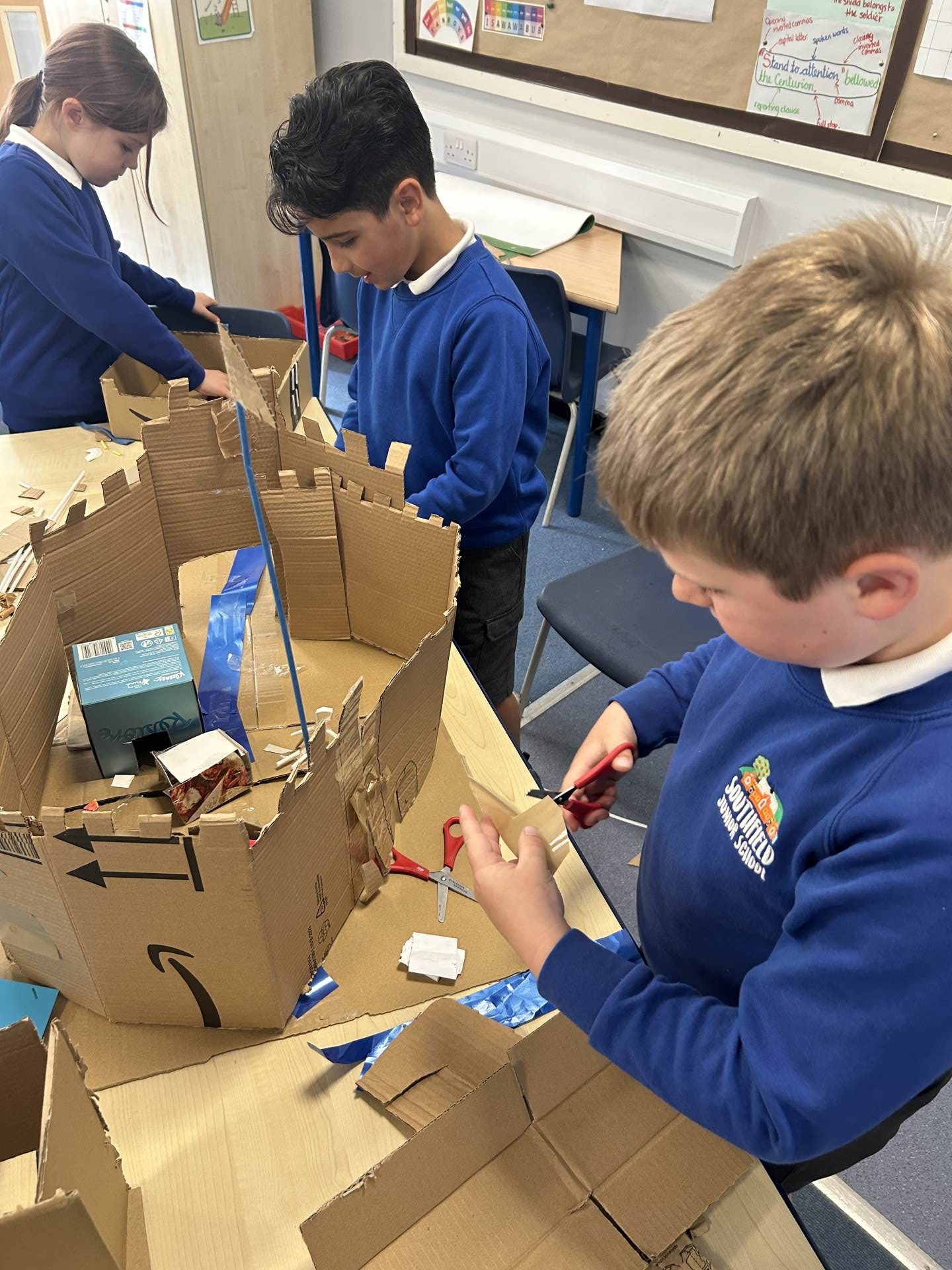 This term, our Year 3 and 4 have stepped back in time to explore the fascinating world of the Romans. As an introduction to our Romans topic, the children worked collaboratively to plan, design and build their own cardboard Roman Empire. Using boxes, tubes and plenty of imagination (and DT skills), they recreated forts, roads, water ways and temples, carefully thinking about how the Romans built and organised their cities. The project encouraged teamwork, creativity and problem-solving, and the children took great pride in seeing their empire take shape. Following this, the children wrote detailed setting descriptions inspired by their models, generating rich vocabulary and expanded noun phrases to bring their Roman worlds to life. The enthusiasm across the classes has been fantastic, and we can’t wait to celebrate all their hard work and learning later on this term.