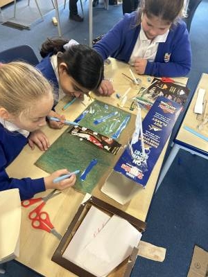 Inspired by the work of William Morris, the children experimented with glue batik, transforming their drawings into striking textile designs. They enjoyed applying PVA glue to outline their motifs, added colour using watercolour paint, and loved revealing their finished patterns once the glue was washed away.