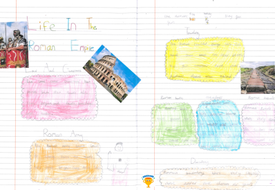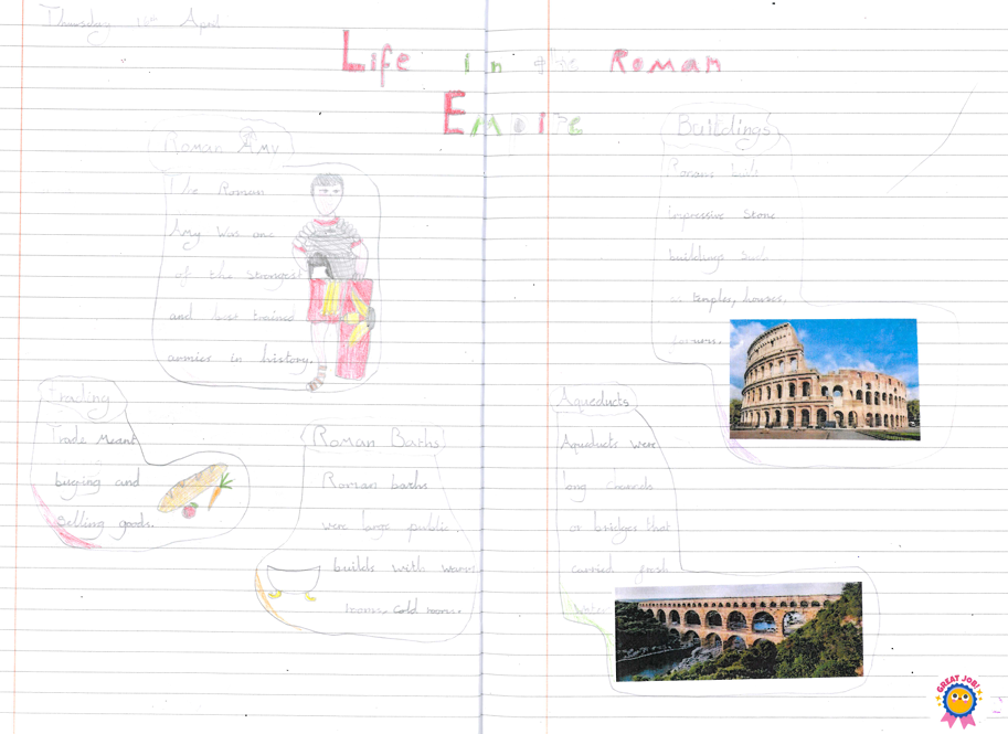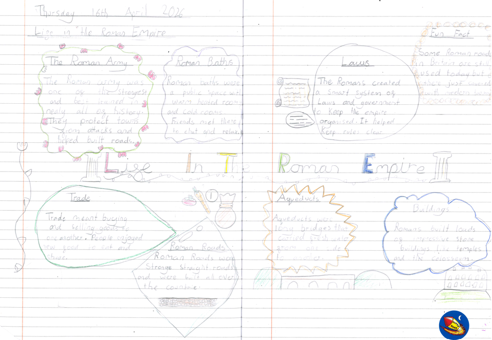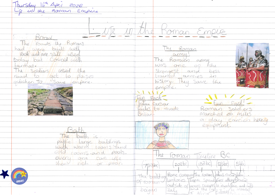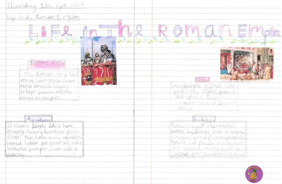 In English, the children have been learning about what life was like in the Roman Empire, using the information they gathered to create a mini non‑chronological report in their books titled Life in the Roman Empire, where they organised their writing using headings, subheadings, colour and images.